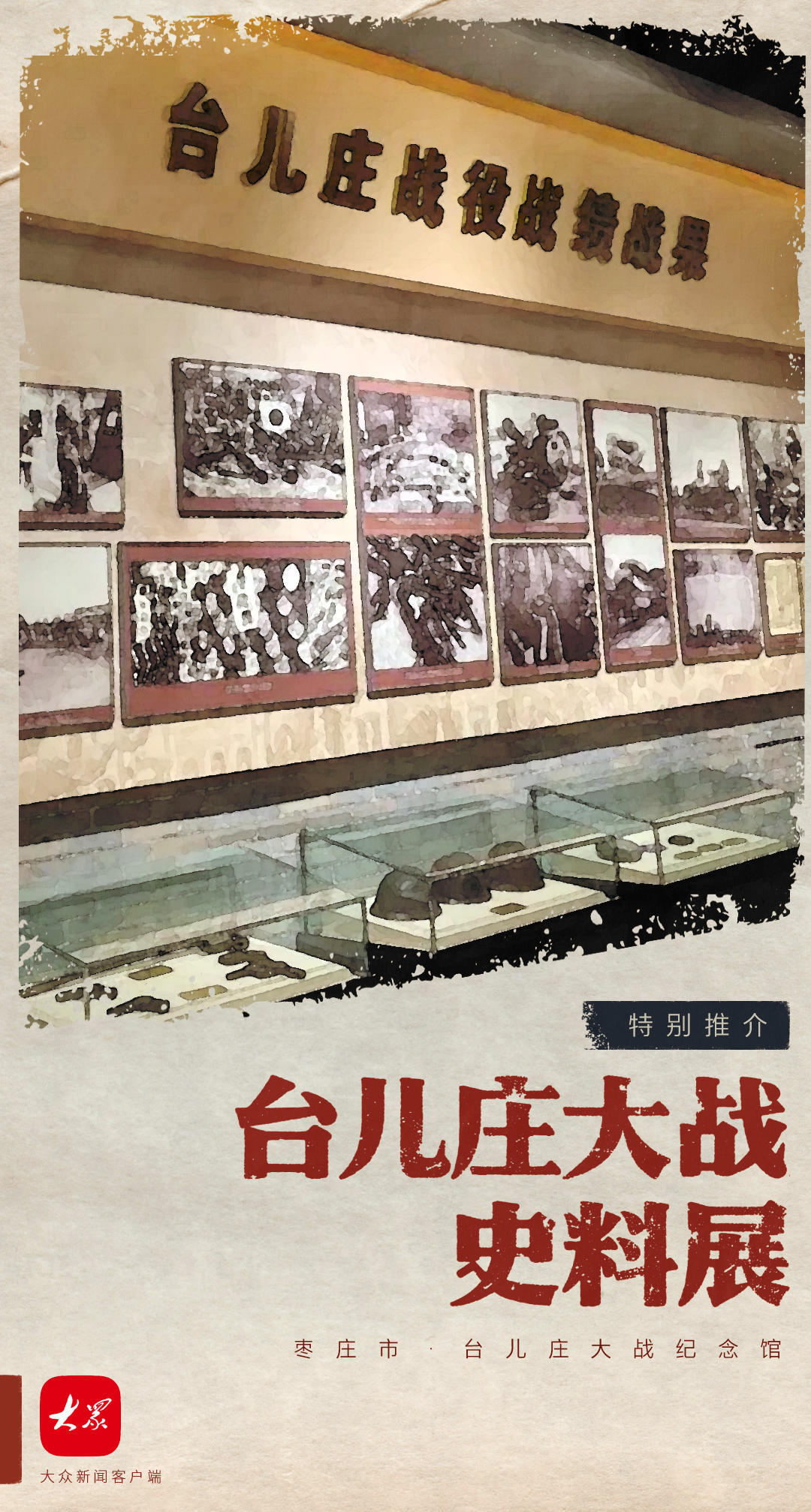 台儿庄大战纪念馆的台儿庄大战史料展陈列台儿庄大战期间中日双方珍贵文物史料千余件,通过科学陈列历史文物、历史图片、文献资料,结合重点场景仿真复原及雕塑、油画、影视作品、多媒体技术等多元形式,生动再现了台儿庄大战中爱国将士浴血奋战、保家卫国的慷慨壮举。