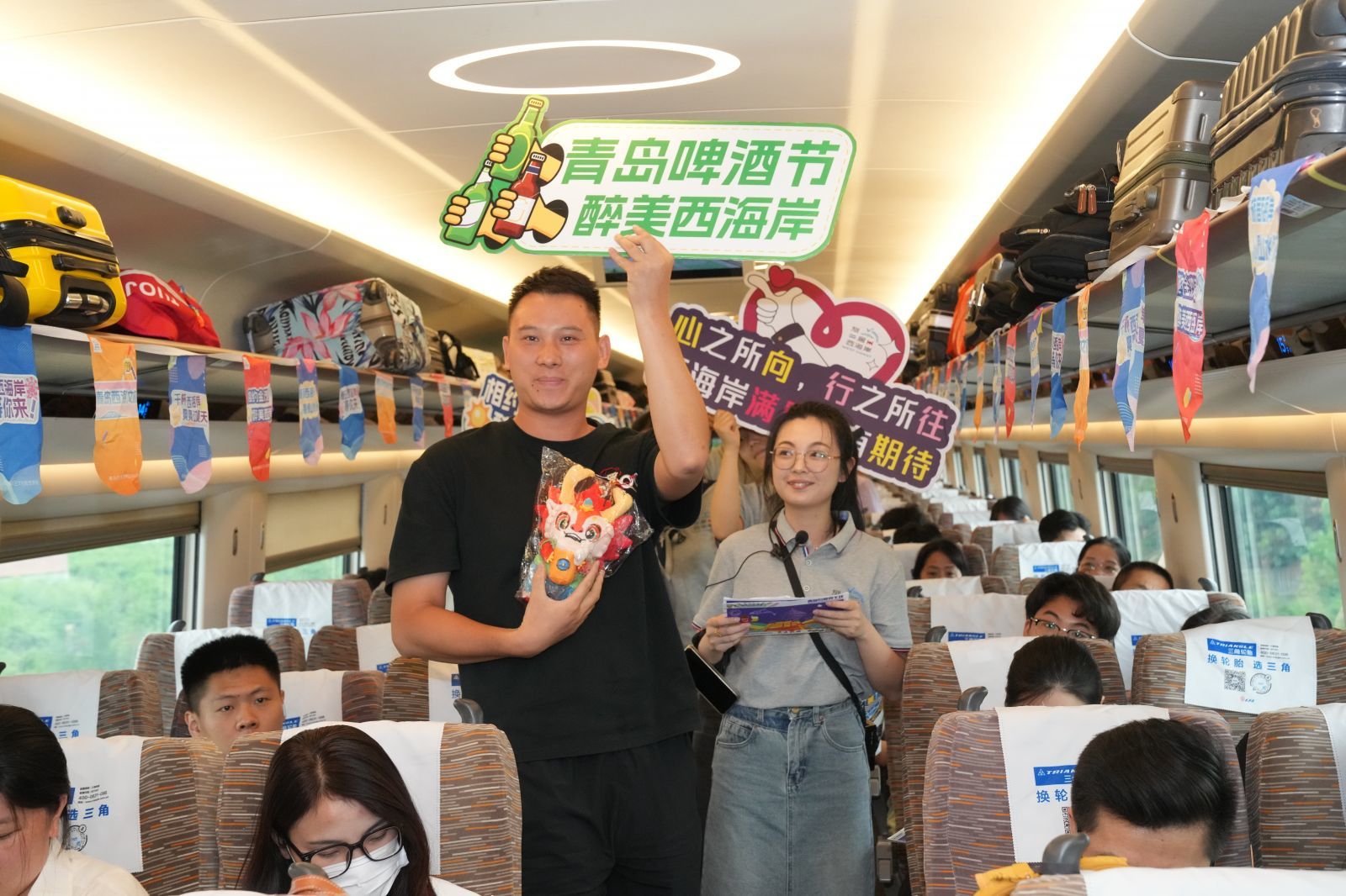 今年暑期,7月18日至8月16日,青岛国际啤酒节在青岛西海岸金沙滩啤酒城隆重举办。啤酒节期间,为方便旅客出行,国铁济南局携手青岛西海岸文旅,联合开行“啤酒节”专线列车,高铁列车融合啤酒文化、旅游推广,打造沉浸式啤酒主题列车体验。在被装扮一新的主题车厢,工作人员为旅客发放宣传单,介绍啤酒文化、旅游攻略,有奖竞猜、答题互动趣味活动让旅途充满了欢声笑语。