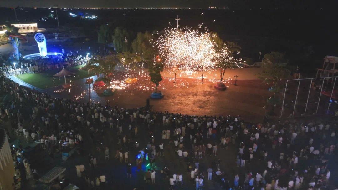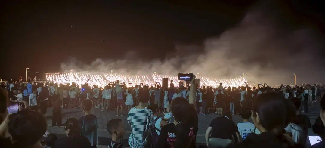 在海神广场,烟花瀑布准时绽放,绚丽的烟花如瀑布般倾泻而下,照亮整个夜空,将浪漫氛围推向高潮。