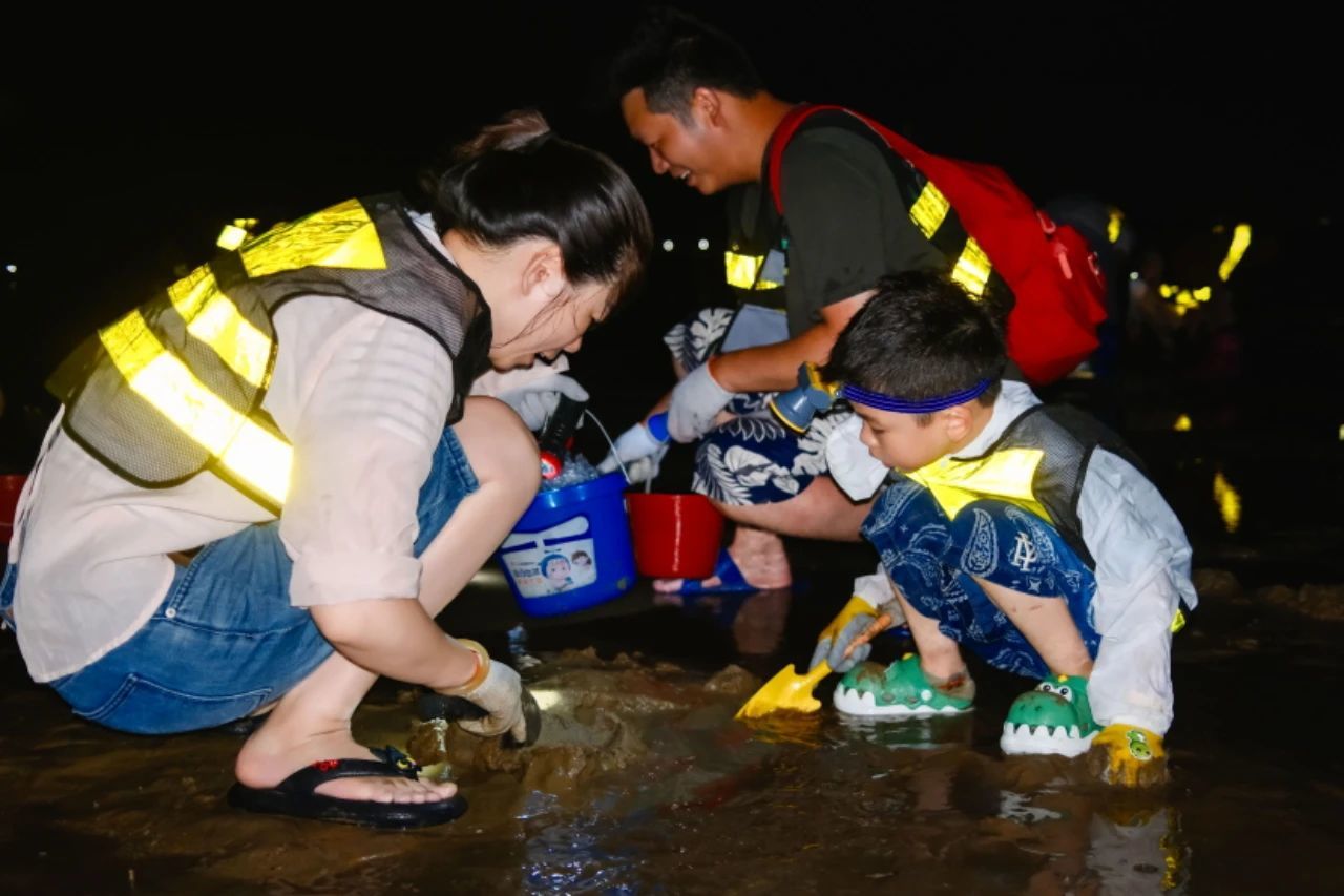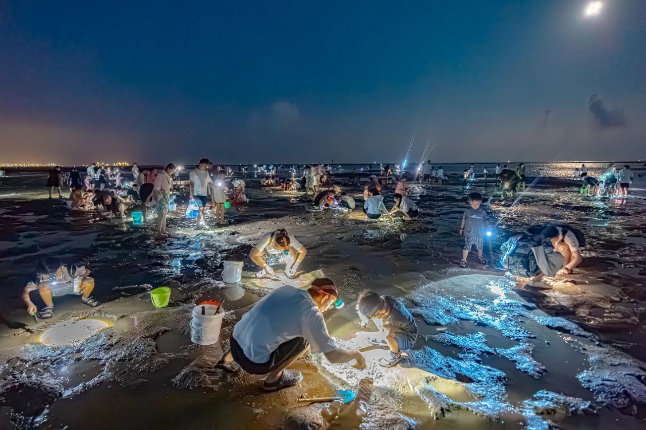 夜幕降临潮水退去时,提着小桶、头灯寻宝:小螃蟹横行沙窝、贝壳藏在礁石缝,运气好还能邂逅搁浅的小海鲜~