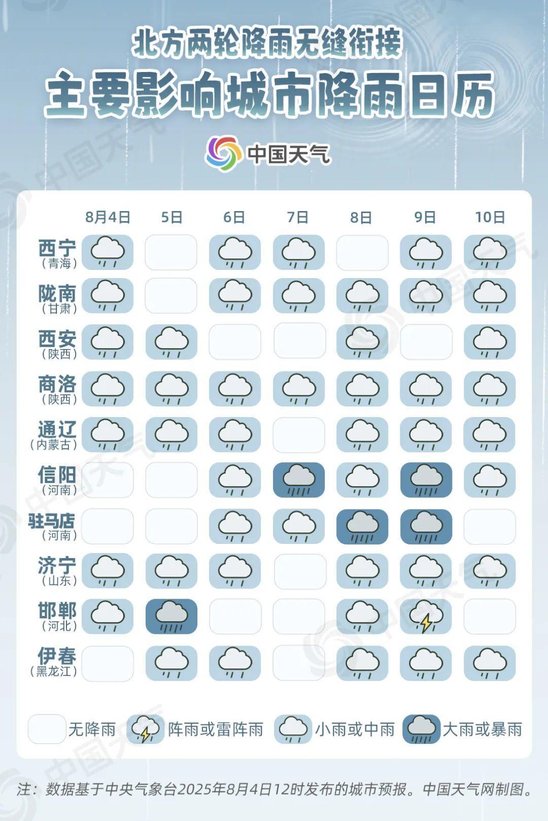 从北方主要影响城市降雨日历来看,4日至10日,陕西商洛雨水将全勤“打卡”,甘肃陇南、山东济宁、内蒙古通辽也几乎天天下雨,青海西宁、河南信阳、黑龙江伊春雨日可达5天,陕西西安、河南驻马店、河北邯郸降雨日数也将过半,可达4天。