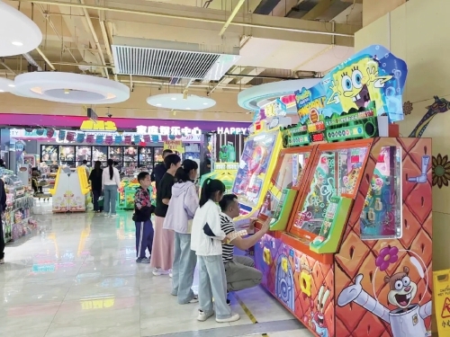 在济阳一家商场内,孩子们在娱乐设施前玩耍。