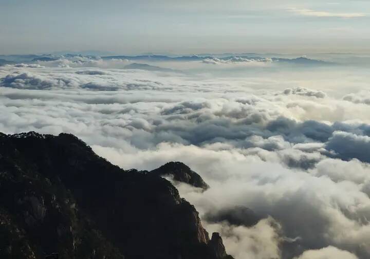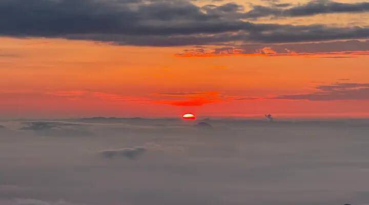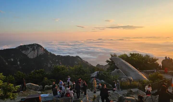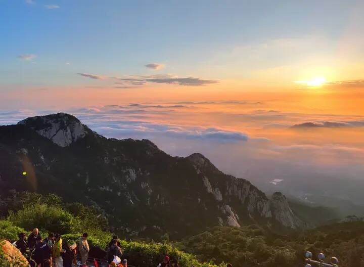 随着天际渐白,日出拉开帷幕。鱼肚白染上橙红,云海化作灵动底色,日光穿透层云,洒向千山万壑,雾气也被镀上琥珀光泽,瞬间点燃众人惊叹,游客们纷纷用镜头定格这磅礴瞬间。