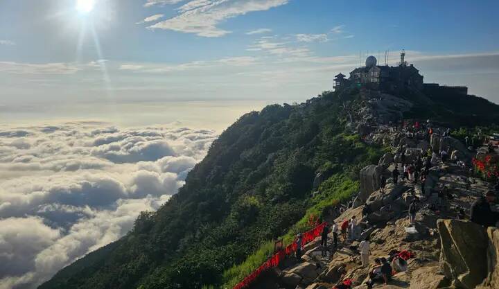 日出后,蓝天登场。晴空下,泰山褪去晨昏的朦胧,山峦轮廓清晰,云海在阳光里更显层次,或卷或舒,与山顶建筑、葱郁植被相映成趣,游客漫步山间,饱览这由夜色、日出、蓝天串联起的天地盛景。