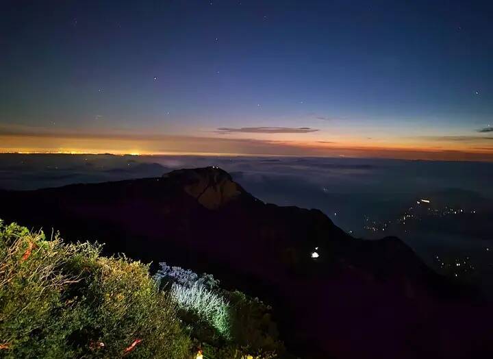 夜幕中,泰山被星芒与云海环抱。云海翻涌如墨色绒毯,星辰似镶嵌其上的宝石。山风拂过,松涛与快门声交织,勾勒出静谧又热闹的夜之图景。