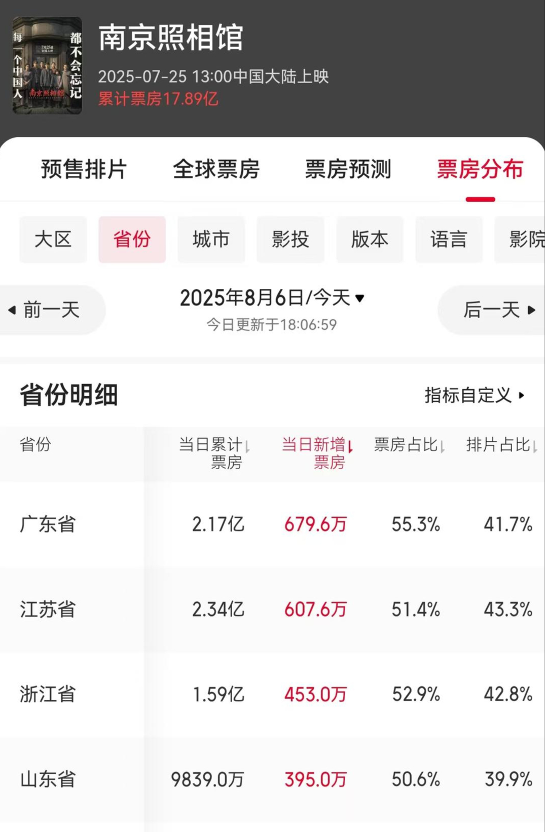 其中,《南京照相馆》暂列档期票房第一位,累计17.91亿元。截至8月6日18时,据相关平台数据,在这近18亿元的票房中,山东省贡献了超9839.0万,在全国各省份中位列第四。
