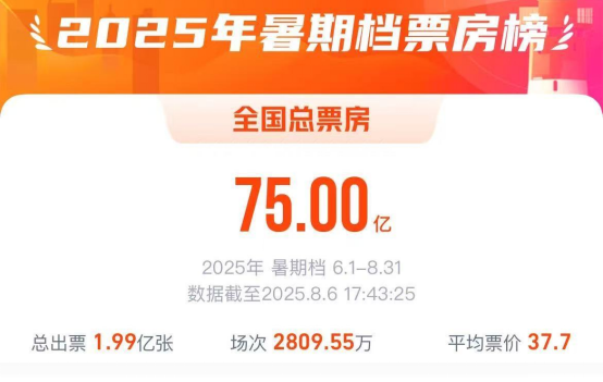 据网络平台数据,截至8月6日17时43分,2025年暑期档(6月—8月)总票房(含预售)突破75亿!