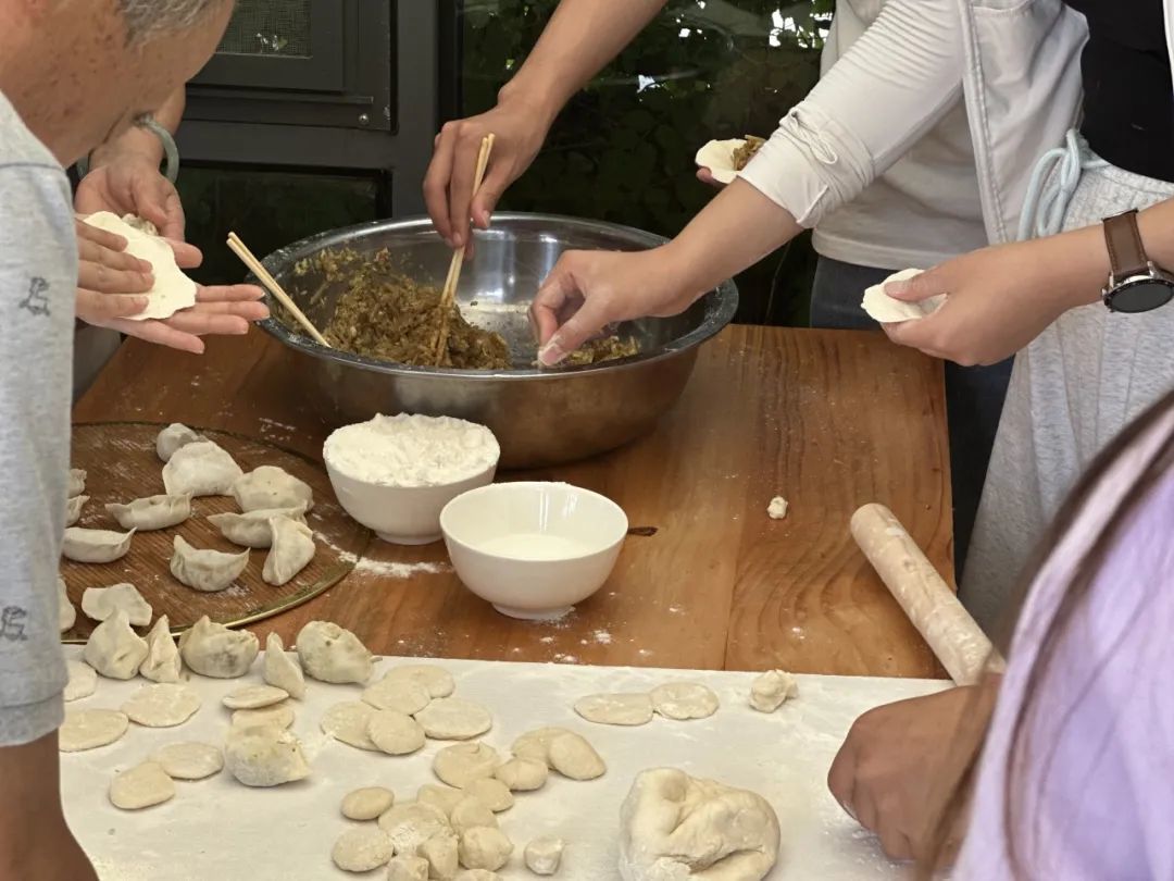 队员们则专注地捏着小巧的饺子,有人开始尝试包出精致的柳叶边,有人则别出心裁地捏出了绽放的太阳花。来自山西的队员挽起袖子,将面团拉成薄如蝉翼的面皮,为大家展示家乡的手擀面做法。
