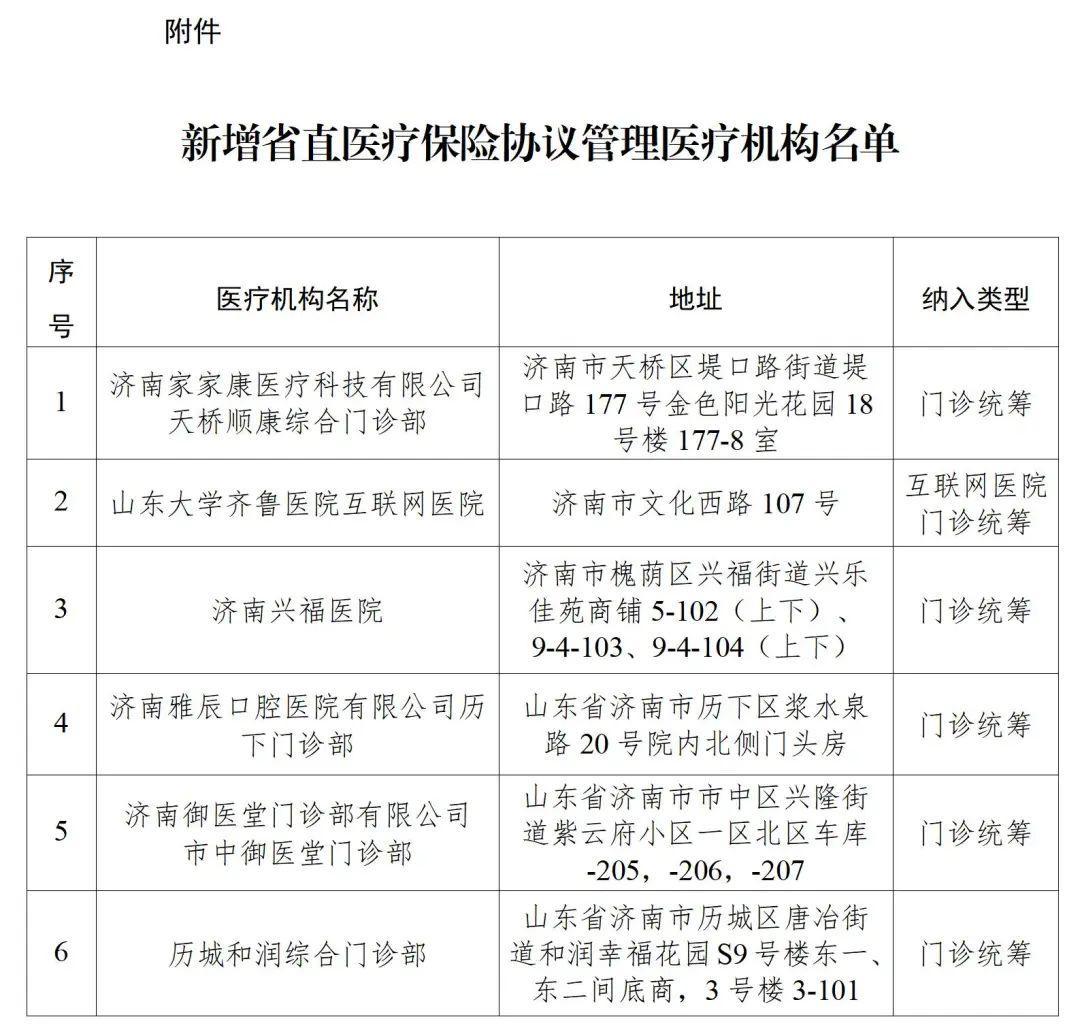 根据《医疗机构医疗保障定点管理暂行办法》(国家医疗保障局令第2号)和《关于进一步做好省直医疗保险新增医药机构协议定点工作的通知》(鲁医保中心发〔2024〕5号)等有关规定,经审核评估、结果公示,确定增加济南家家康医疗科技有限公司天桥顺康综合门诊部等6家医疗机构为省直医疗保险协议管理医疗机构(名单见附件)。