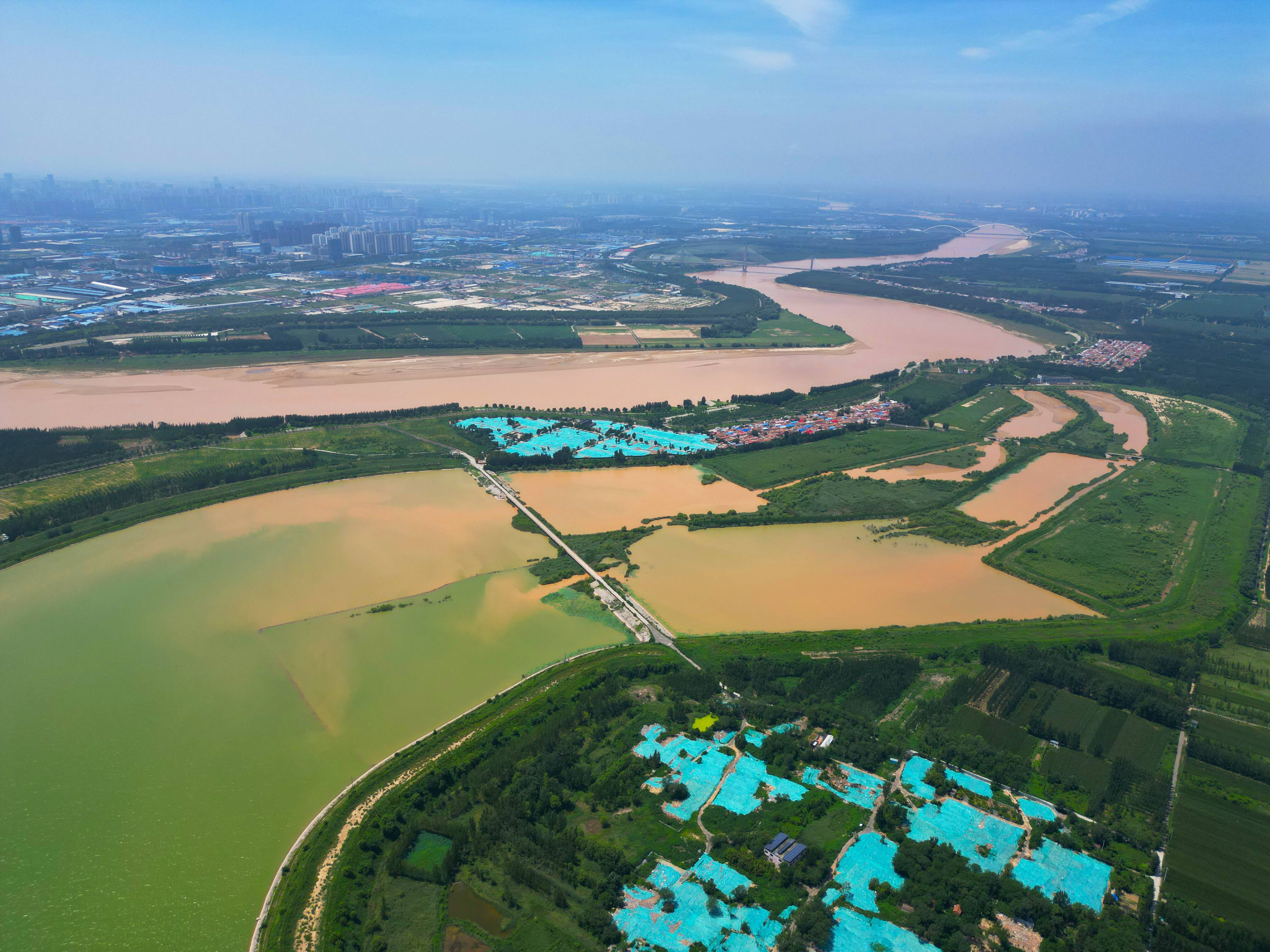 近日,济南鹊山水库沉砂池呈现壮观的"浊清分界"现象。奔腾的黄河水在此缓流沉淀,形成金色浊流与碧色清流交织的生态画卷,该区域作为济南市重要饮用水源地,其自然净化过程持续为城市输送优质水源。 闪电新闻记者 沈熙圃 报道