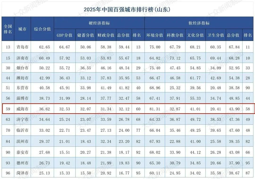 近日,华顿经济研究院在上海发布2025年中国百强城市排行榜,山东共有13个城市上榜,数量和江苏并列第一,其中威海位列第59名。
