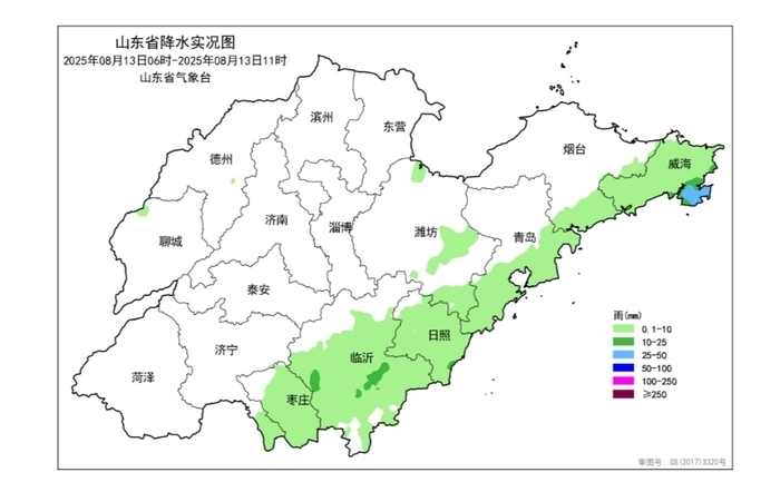 8月13日6时至13日11时,山东全省共有9市、35县(区市)、508乡镇出现降水,平均降水量0.6(毫米,下同),折合水量约0.9亿立方米。各市平均:威海6.7、临沂2.3、日照2.0和枣庄1.4,其他市降水量不足1.0或无降水。降水量前3位的是:威海荣成市大疃刘家水库62.0(水文站)、威海荣成市里山上游水库62.0(水文站)和威海荣成市响湾水库61.5(水文站)。