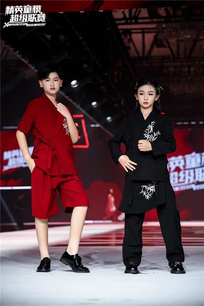 中国非遗时装周亲子秀环节同样看点十足,与黄诗妍搭档的男孩是她模特老师的孩子,有趣的是,这个男孩仅比黄诗妍小三个小时,两人就像一对默契十足的龙凤胎。他们身着风格协调的亲子装,黄诗妍的服装以沉稳的黑为主,尽显酷飒;男孩则穿着同系列的红色秀服,帅气十足。两人一登场,便凭借着这份特殊的缘分和默契的配合吸引了全场目光。黄诗妍从容与稳重,不时侧头与男孩交流,眼神中满是温柔与照顾,而男孩也十分配合,两人的台步灵动轻盈,步伐协调一致,时而同步转身,时而相互对视微笑,将亲子秀的温馨与和谐展现得淋漓尽致,赢得了观众们的阵阵掌声。