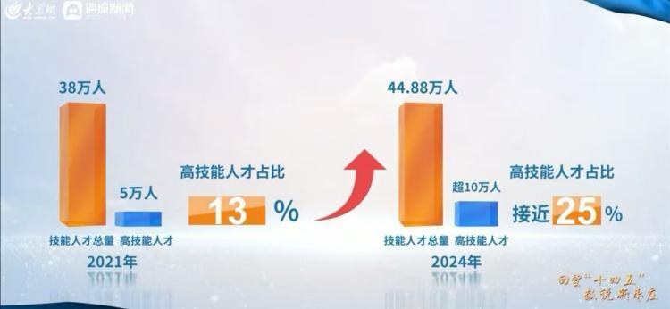 一组数据展示了“十四五”期间,枣庄在技能人才培养方面实现了结构性变革:2021年技能人才总量为38万人,其中高级工以上高技能人才5万人,占13%;2024年这两项数据分别达到了44.88万人、超10万人,后者占比接近25%。