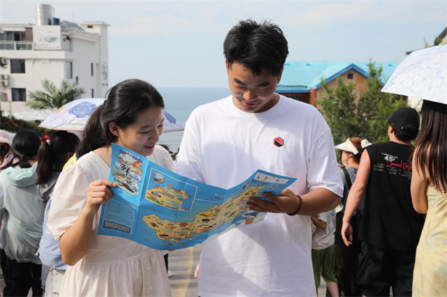 近日,在高区火炬八街,来自临沂的游客张天宇、张文淼兄妹收到了一份特殊的礼物——《寻鲜威海》手绘地图。“有了这份‘尝鲜’指南,不愁找不到地方特色美食了。”张天宇一边翻阅着地图一边说。这份《寻鲜威海》手绘地图是威海市海洋发展局围绕“1+3+N”渔业品牌体系、综合威海丰富海洋文化与地域特色倾心打造的海鲜“导航”。