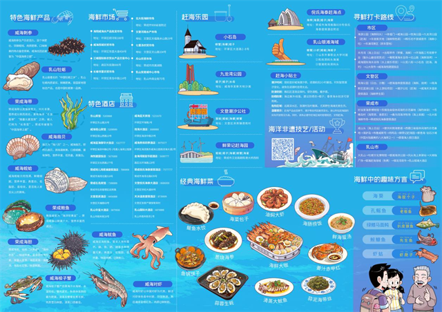 地图反面分为“特色海鲜产品”“海鲜市场”“特色酒店”“赶海乐园”“经典海鲜菜”“海洋非遗技艺/活动”“寻鲜打卡路线”“海鲜中的趣味方言”等八大板块,介绍了威海刺参、乳山牡蛎、荣成海带等特色海产品,并附上了海鲜市场、特色酒店、赶海乐园地址信息,甚至贴心推出了四条打卡路线,方便使用者提前规划行程、预订餐位。