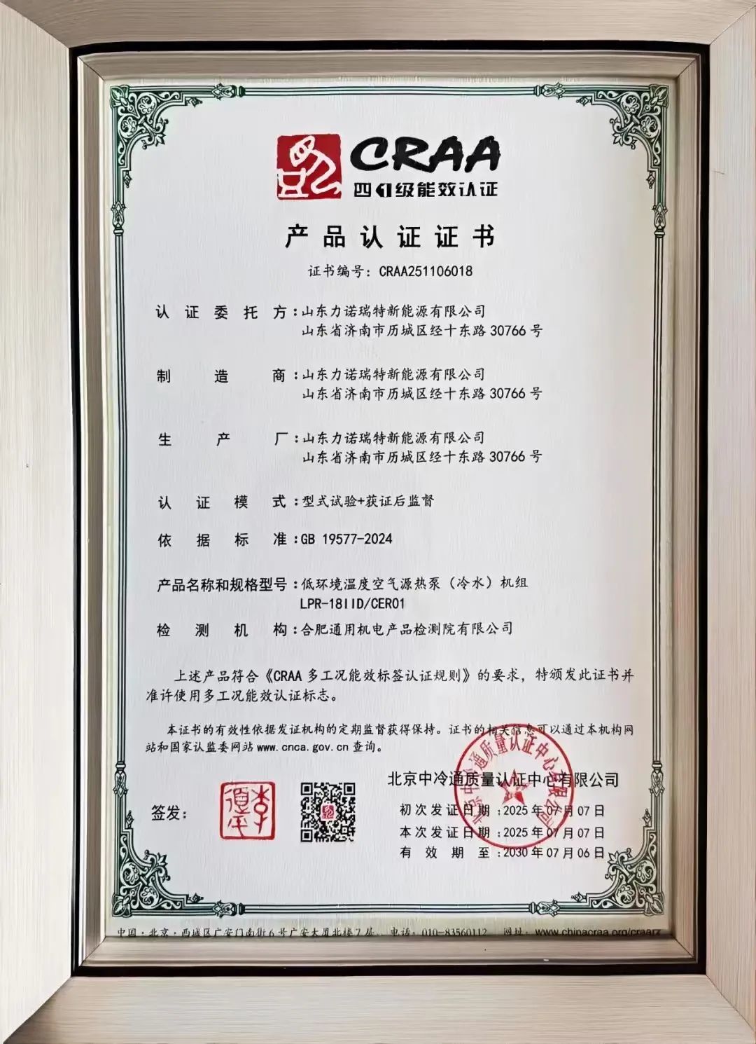 7月15日,在2025中国热泵行业年会上,力诺瑞特“真好”系列空气源热泵采暖/热水机组成功斩获CRAA“四1级”认证证书,成为国内首批通过该综合性能评定达到四1级标准指标的产品,并获得CRAA“四1级”能效标签认证。