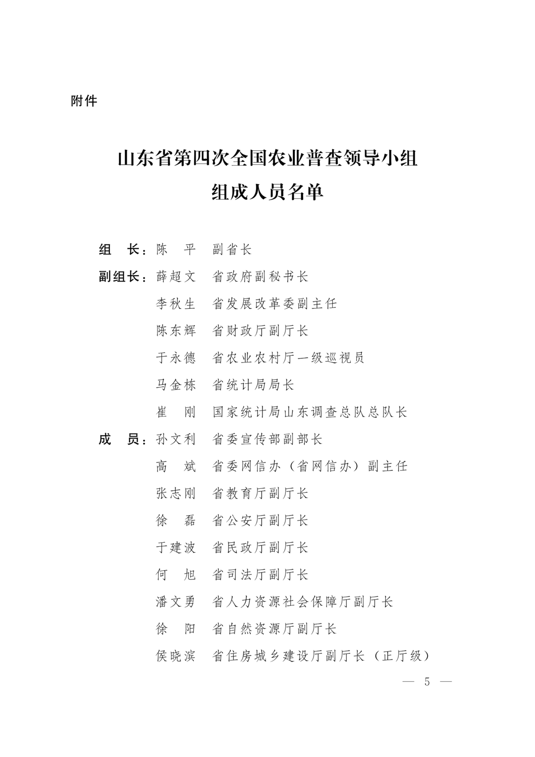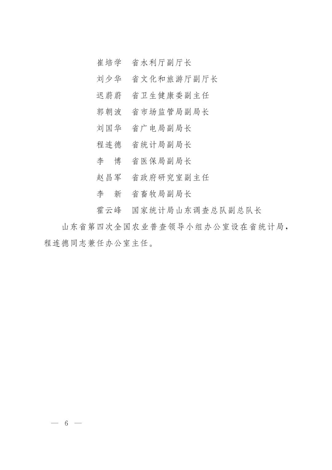 设立山东省第四次全国农业普查领导小组,负责普查的组织和实施工作。普查领导小组办公室设在省统计局,具体负责普查日常工作的组织和协调。该领导小组为临时性工作机制,不作为省级议事协调机构管理,普查任务完成后自动撤销。各市、县(市、区)政府要严格按照国家统一的普查对象和范围、内容和时间等要求,认真组织实施好本区域的普查工作。充分发挥乡镇政府(街道办事处)和村民委员会(居民委员会)的作用,广泛动员和组织社会力量参与配合普查工作。各级普查机构根据工作需要,可以依法聘用或者从有关单位商调符合条件的普查指导员和普查员(以下简称“两员”),及时支付聘用人员的劳动报酬,保证商调人员在原单位的工资、福利及其他待遇不变,并保留其原有工作岗位,稳定普查工作队伍,确保普查工作顺利进行。