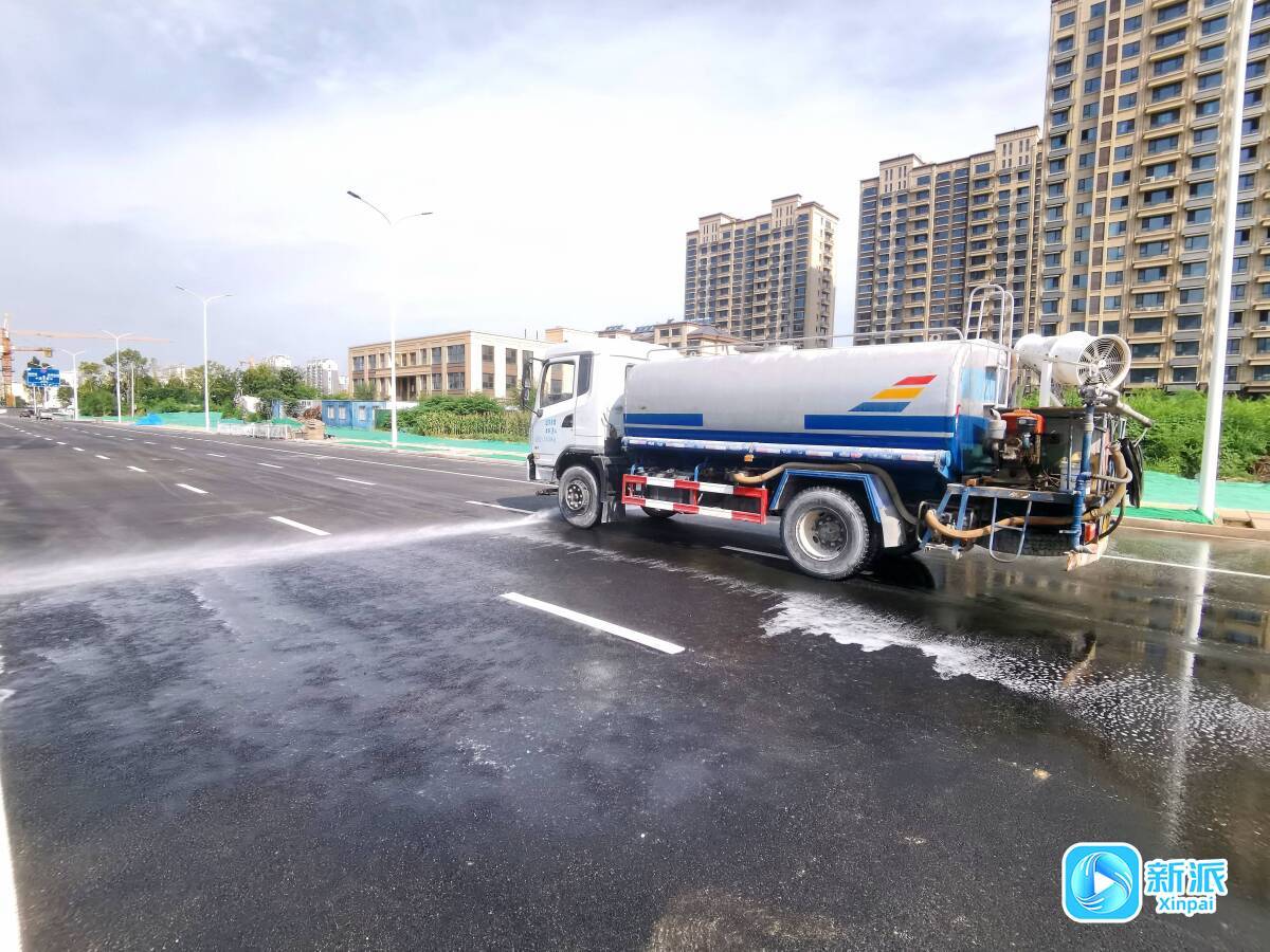 卧龙东街(虞兴路-文化路)段,洒水车冲刷路面,为通车做准备。