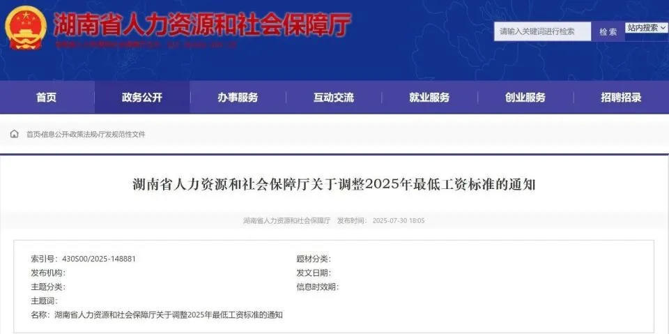 湖南省人社厅于近日印发了《关于调整2025年最低工资标准的通知》,从2025年9月1日起,调整全省最低工资标准。