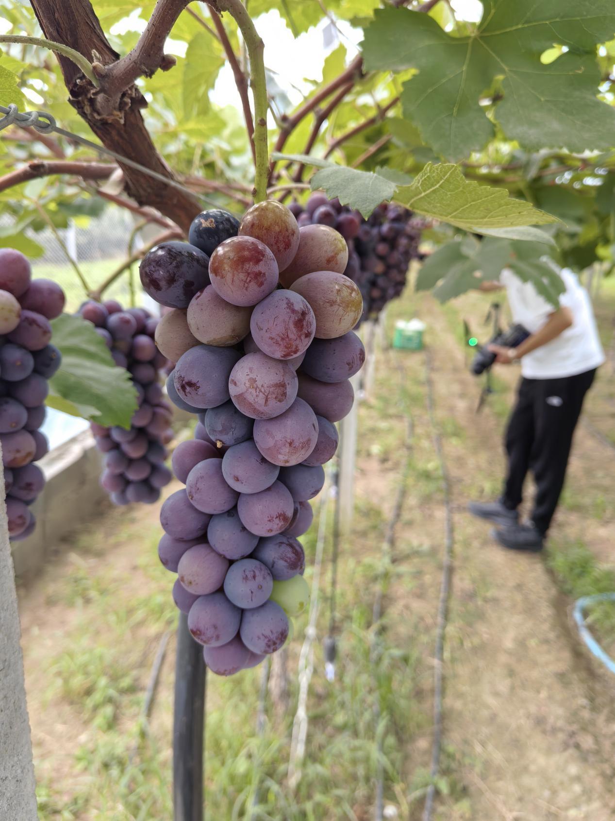 在东安城葡萄园的连体钢架大棚,香味扑鼻的阳光玫瑰垂挂枝头,通过智慧管理,葡萄亩产稳定在3000斤以上,亩均收入可达4万元。