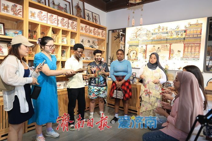 随后,留学生们转至百花洲传统街区,走进济南市文物保护中心,开展了一场别开生面的非遗文化体验课。在皮影戏展示环节,国家级非遗项目济南皮影戏传承人李娟为留学生们系统讲解了皮影戏的历史源流、制作工艺与表演技巧,并现场演绎了经典剧目片段。留学生们不仅看得入神,更踊跃尝试操作皮影,在光影交错间体验这一古老艺术的独特魅力。