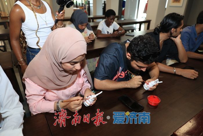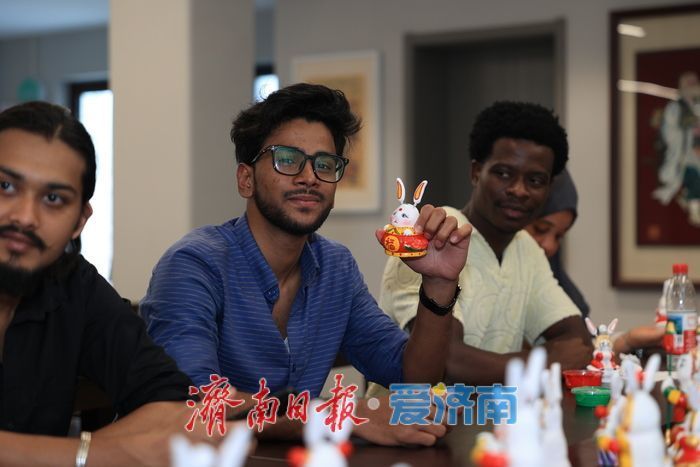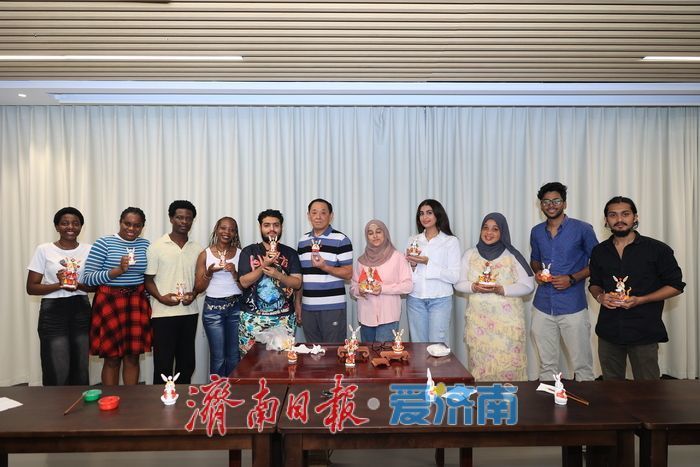 活动中,留学生们还近距离接触了济南另一项传统非遗——“兔子王”泥塑。他们认真聆听传承人介绍其民俗寓意与制作工艺,并亲手为“兔子王”彩绘上色,在实践过程中进一步理解济南民间艺术中所蕴含的美好祝愿与地域特色。