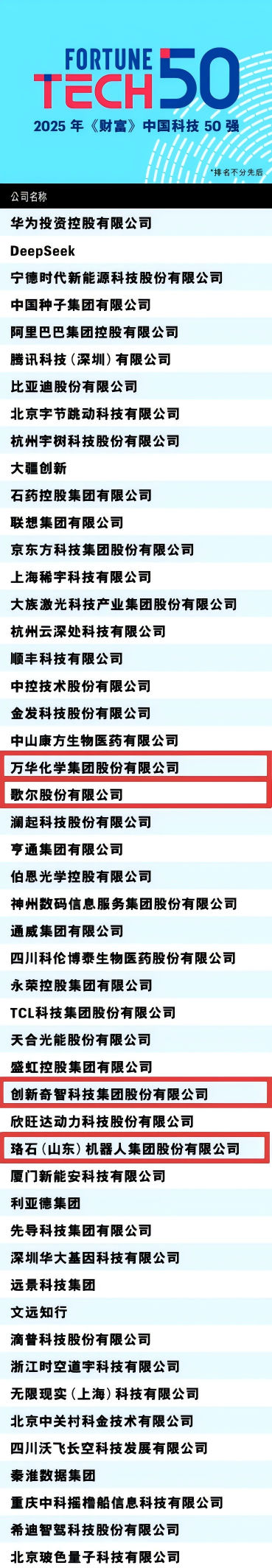 8月21日,2025年《财富》中国科技50强榜单揭晓,这是《财富》第二年发布榜单。山东今年共有4家企业上榜,分别为万华化学集团股份有限公司、歌尔股份有限公司、创新奇智科技集团股份有限公司、珞石(山东)机器人集团股份有限公司。与去年对照,万华化学再次上榜,另外3家企业新上榜。