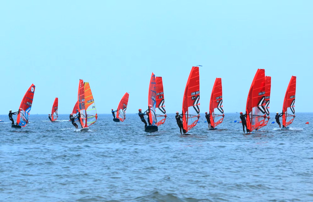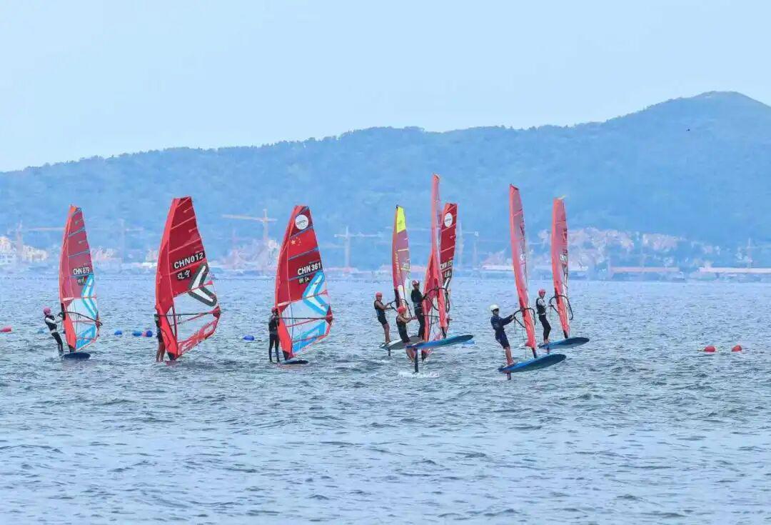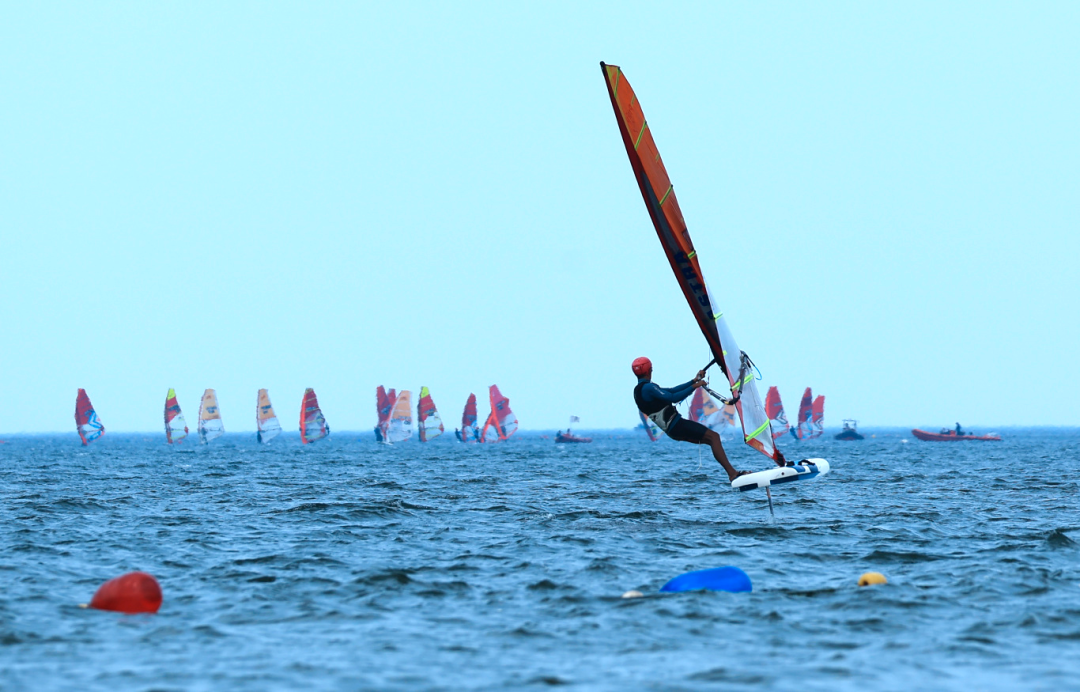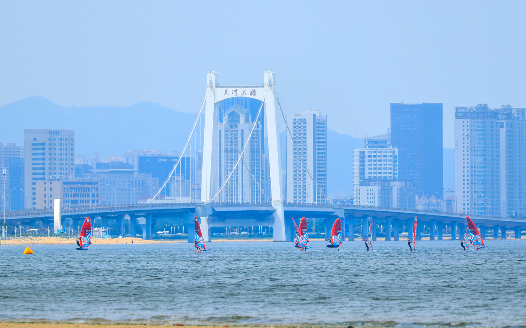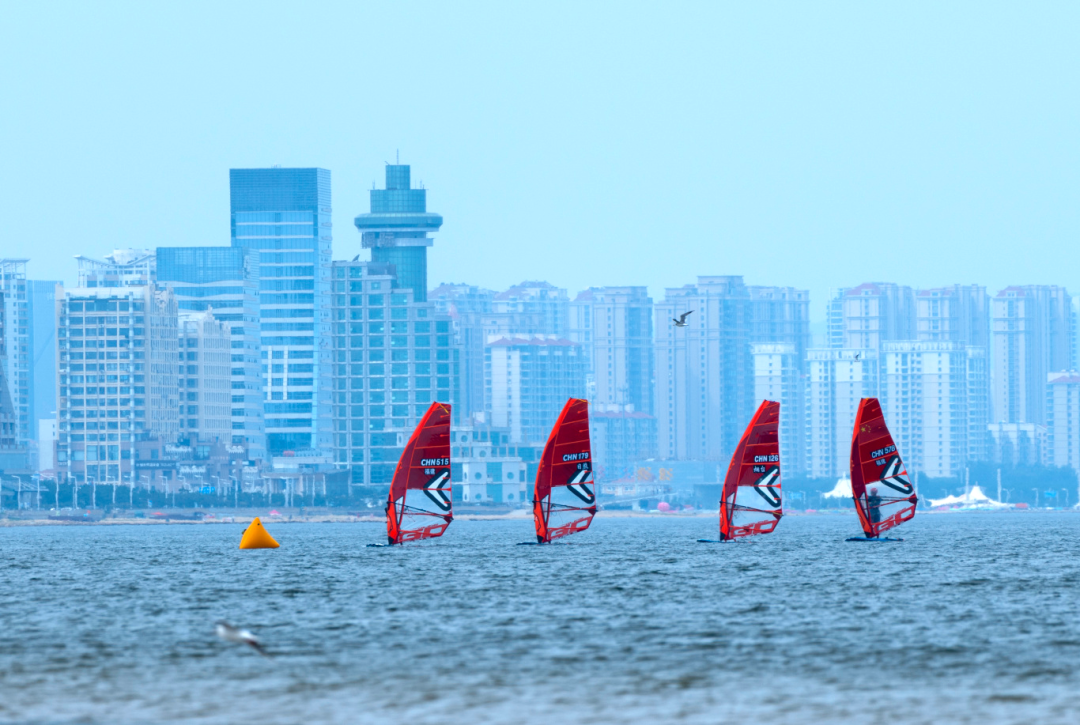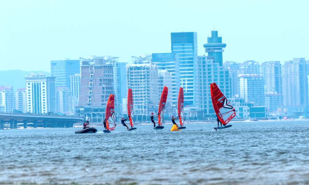 初秋时节,幸福湾海域碧海无垠,多名运动员驾驭着科技感十足的水翼帆板破浪疾驰,尽显扬帆争流的水上“速度与激情”。