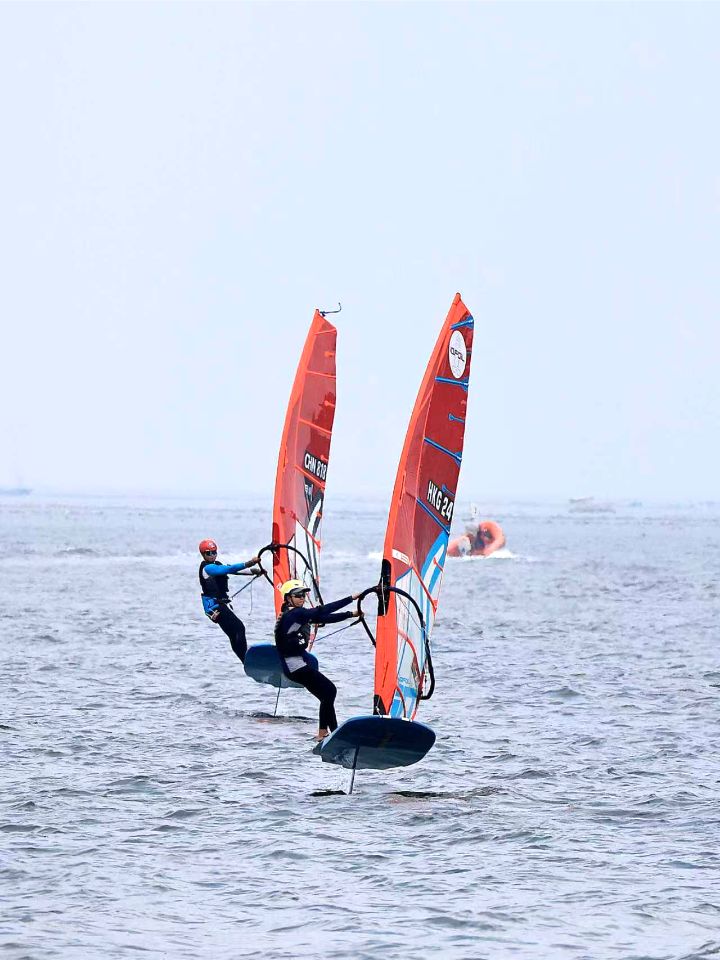 比赛过程中,运动员们精准捕捉风与海浪的实时变化,通过调整身体倾斜角度、转移重心、判断帆面迎风角度等细微操作,控制板体姿态并高效释放水翼升力,最终将风能转化为向前突进的动力,展现出高超的运动技巧与对自然力量的精准运用。