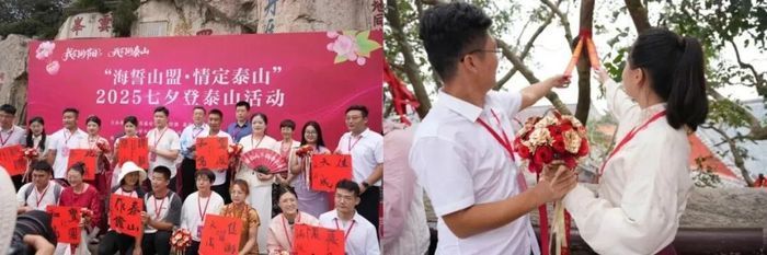 8月29日,泰山区举办“海誓山盟·情定泰山”2025七夕登泰山活动,来自全国的100对新婚夫妇齐聚泰山之巅,身着传统服饰,手持捧花,在象征永恒的唐摩崖石刻前庄重而立,集体宣读《泰山婚誓》,在泰山的见证下,许下矢志不渝的爱情誓言,将浪漫时刻定格在苍松云海之间。