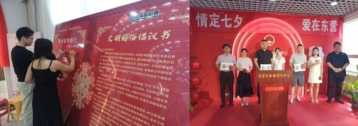 8月29日,东营区举行“情定七夕 爱在东营”主题活动,设置集体颁证环节,新人宣读结婚誓词并签订“文明婚俗承诺书”。婚姻辅导员现场解读婚俗文化、讲授“新婚第一课”,营造文明和谐的节日氛围。