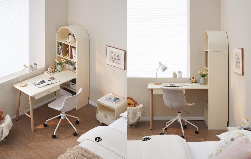 拱形书架搭配书桌搭台,宝贝学习的好搭子。奶油感配色温馨简约,浅色系适配各种风格,经典百搭。拱形书架装饰与收纳功能兼具,开放式设计让书籍、课本、文具等随手可取。1.2米圆角书桌搭台,延展学习空间,大小户型都适用。桌下带薄抽屉,常用文具开抽即拿,方便顺手。A字形橡胶木实木桌腿,横梁加固,稳固承托不晃动。