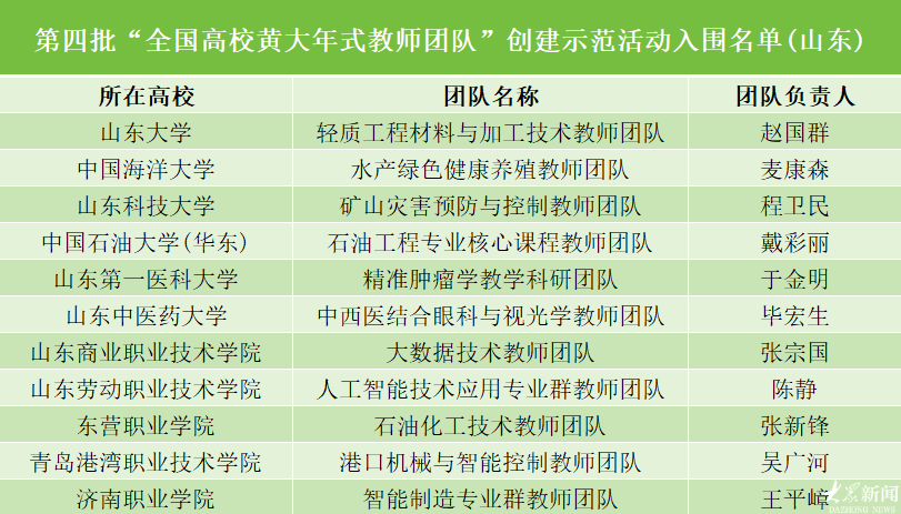 9月5日,教育部公布第四批“全国高校黄大年式教师团队”创建示范活动入围名单,山东共11所高校的11个教师团队上榜,比2023年的第三批在数量上增加了4个。