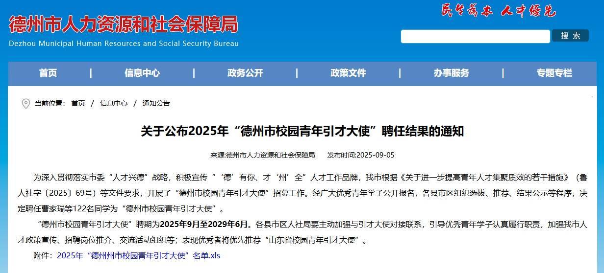 9月5日,德州市人力资源和社会保障局公布2025年“德州市校园青年引才大使”聘任结果。经广大优秀青年学子公开报名,各县市区组织选拔、推荐、结果公示等程序,决定聘任曹家瑞等122名同学为“德州市校园青年引才大使”。