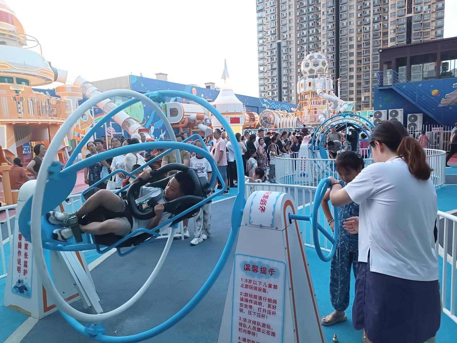 “这边景观很漂亮,而且很热闹特别是到傍晚的时候。”家长宋女士介绍,“很多家长在带娃玩耍的同时,又能欣赏夕阳美景。”傍晚时分,闪烁着梦幻光芒的太空通道轮廓灯线与不远处的天空之境交相辉映,组成了独特的风景线。