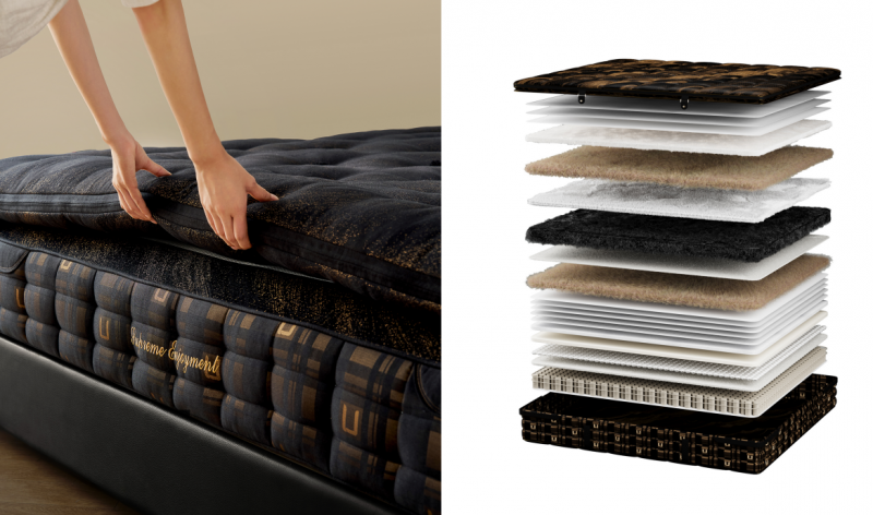 搭配两种睡感,追求极致舒睡体验。正面柔软似云朵包裹,移除顶垫后,则为刚刚好的云端柔弹感。垫层以天然材质为基底,足量奢级用材,5+1珍稀纤维百分百展现天然属性,实现亲肤舒适、透气、弹性支撑的多维平衡。