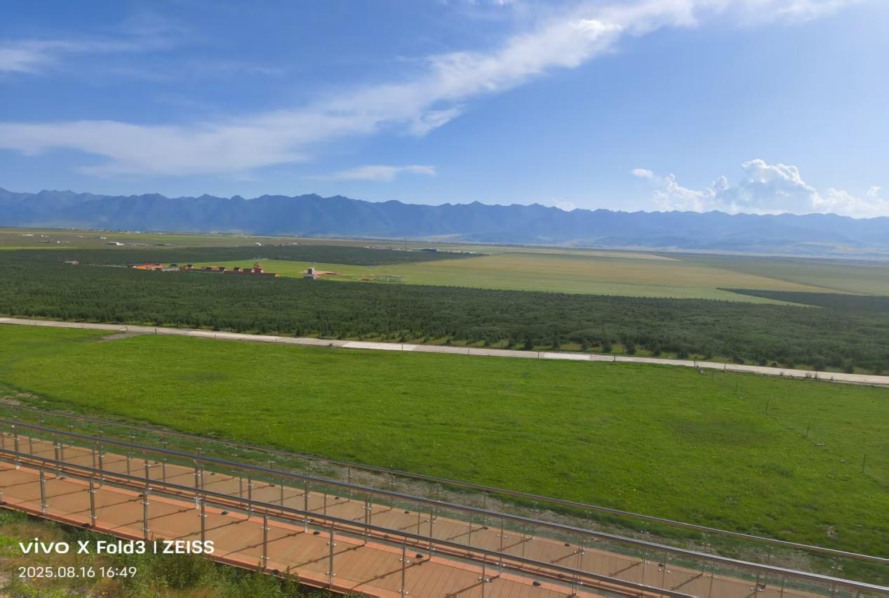 在拥堵的国道上一直缓慢前行到了峨堡古镇,地图上本地是一处交通要道,南北打通青海甘肃两省,向西可到海北祁连机场和祁连县城,也是甘肃武威到云南孟连的通道之一,通常大货车司机都会在此补充给养。我们到峨堡镇后车需要充电,在拥堵繁华的小镇上找到一处充电站,发现充电的人很多需排长队,同时任总、常总可能是出现了高反身体不适,常总鼻孔出血,任总心情极度烦躁。不得已我们看导航,这里不远处可以上高速,剩余的电是可以把车开到服务区的,我们就调头向高速公路的服务区走去。真是天不随人愿!到服务区后服务人员说本服务区停电检修,老天呢!向前开电不足不敢跑,回去的话需要到下一出口转回电还是不够,与服务区人员交流充电无果后,只能从服务区地下通道穿到对面,采取非正常的方式回峨堡镇。再次来到峨堡镇时两位旅友高反也稳定了,排队等待充电过程中,我简单参观了一下古镇,峨堡古镇位于青海海北藏族自治洲,始建于公元1206至1279年,蒙古语“喀尔玛”意为红色古城,当地藏族、蒙古族、回族等民族和谐共处,形成了独特的民俗文化。现存遗址东西长230米,南北长280米,城高6米,它是古丝绸南路的重要节点,兼具军事要塞与多民族文化交融的特色。我们在镇上水果摊买了点水果补充营养,与排队充电的同行们交流当地的风景和民情。 翻越祁连山后,我们走到了海北藏族自治州门源回族自治县,车窗外油菜地在花期后显的墨绿色,从路旁远望山边一片片绿方地,整齐的象美丽的大草原。我们到县城后在附近小区充电站充电,等待期间我们四人坐在行李箱上打扑克,李总和我打掼蛋配合默契,让常总、任总既羡慕、又嫉妒还恨我们眼神交流,其实一路上充电期间都是打扑克消磨时间,既能娱乐又能消除等待充电的焦虑。