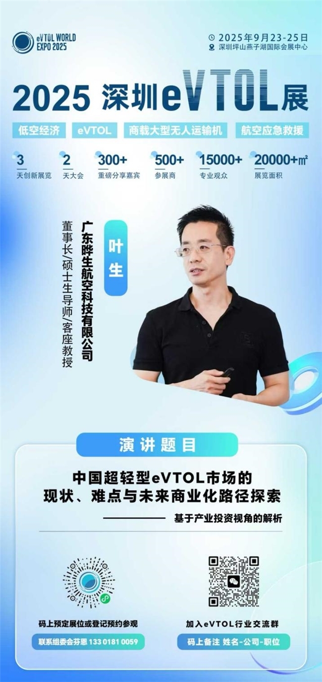 届时,晔生航空董事长叶生将围绕“《中国超轻型eVTOL市场的现状、难点与未来商业化路径探索》——基于产业投资视角的解析”这一主题,分享其深刻的行业洞见。