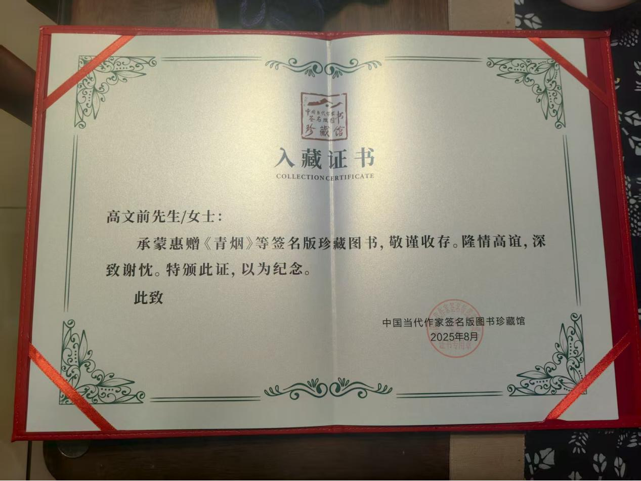 近日,山东省作家协会会员、临沂市作家协会会员高文前创作的长篇小说《青烟》被中国当代作家签名版图书珍藏馆正式收藏。这标志着这部作品不仅获得了地方文学界的肯定,更跻身当代中国文学殿堂。