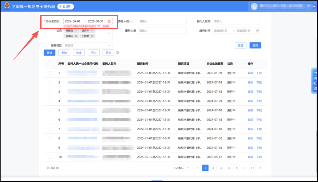 协议要素信息明细默认只显示最近一年生效的协议信息,如果要查询以前年度生效的协议信息,请您调整左上角的“协议生效日期”选项。协议生效日期范围限制为1年,当选择的日期范围超过一年时系统会弹出提示。