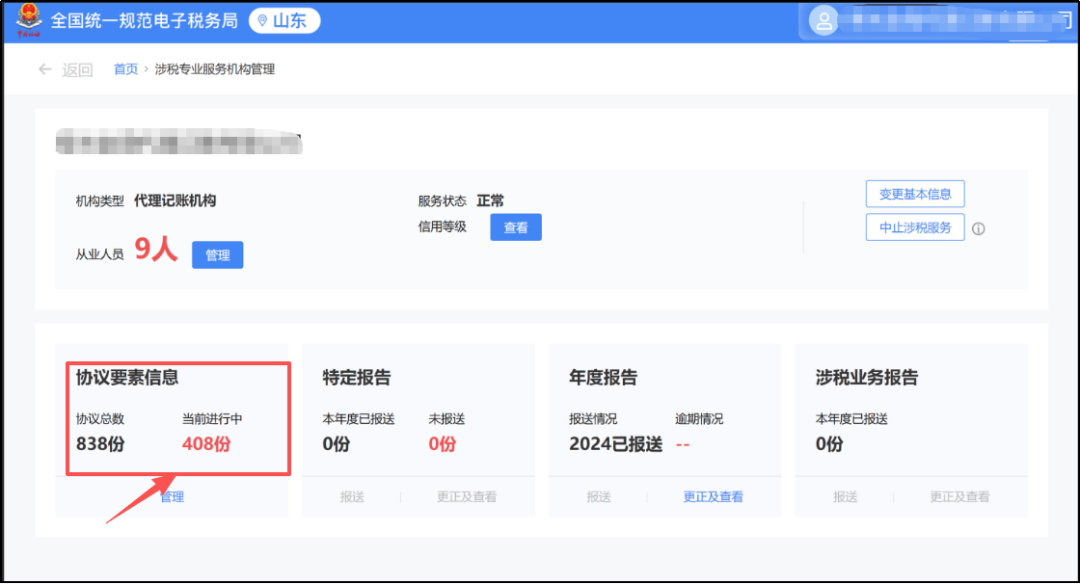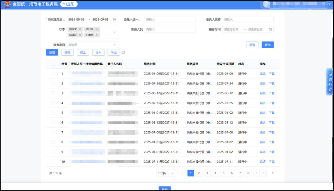 5、我单位是涉税专业服务机构,协议要素信息里面当前进行中的协议有400多条,但是点“管理”按钮查询,系统只显示100多条协议信息,查询的协议数量与显示的当前进行中协议不一致,怎么办?