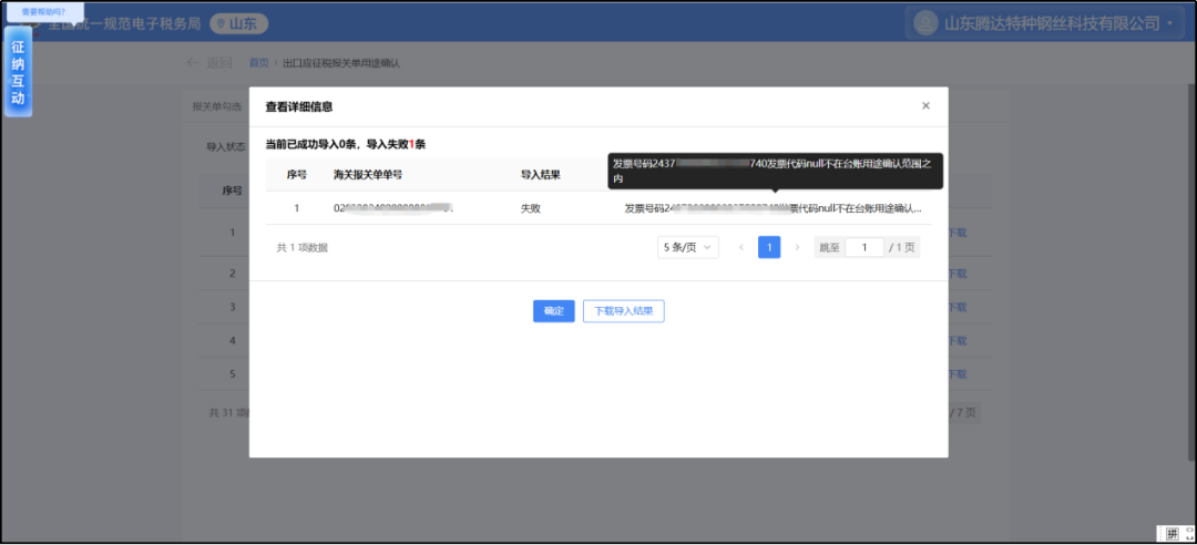 1、我单位在电子税务局“出口应征税报关单用途确认”模块导入报关单,系统提示“发票号码******发票代码null不在台账用途确认范围之内”,怎么办?