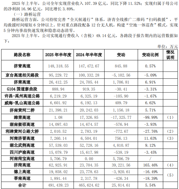山东高速股份有限公司(股票代码:600350)(以下简称“山东高速”)于8月29日发布2025年半年度报告。报告显示,2025年上半年,公司实现营业收入107.39亿元,同比下降11.52%;实现归属于母公司的净利润16.96亿元,同比增长3.89%;扣非归母净利润16.67亿元,同比增长7.50%,呈现出“营收降、利润升”的态势。