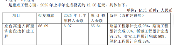重点工程建设方面,山东高速聚力攻坚克难,各项工程全面有序加速推进,其中,京台高速齐河至济南段改扩建项目取得显著进展,路基、路面、桥涵、交安和绿化工程完成率分别达95%、85%、97.2%、80%和39%。