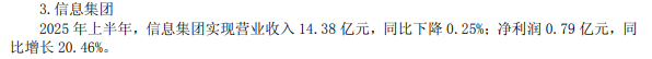 2025年上半年,公司实现投资收益6.39亿元。其中,公司在2023年完成对山东高速信息集团65%股权收购后,2025年上半年信息集团实现营业收入14.38亿元,净利润0.79亿元,同比增长20.46%,该板块已成为新的增长引擎,成为公司智慧交通转型的重要支撑。