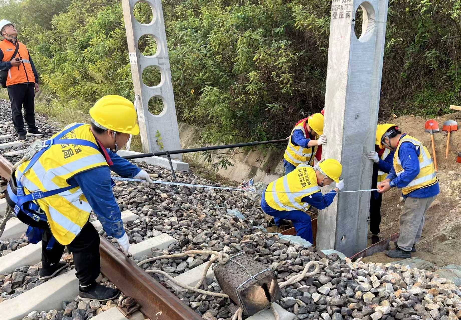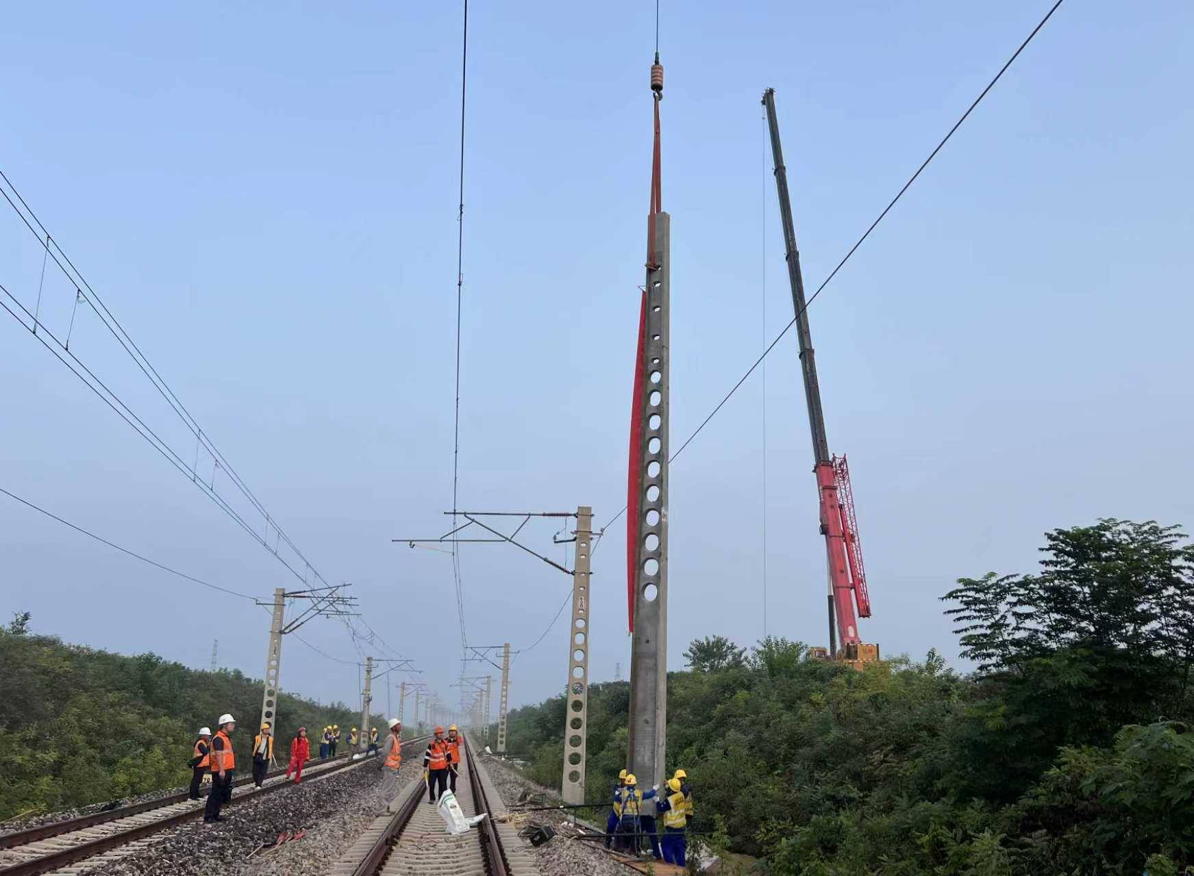 工作人员介绍,龙烟铁路市域化改造接触网工程设计接触网支柱1717根,导线架设130公里。当天组立的接触网支柱地面部分高9.2米,重2.1吨,是龙烟铁路市域化改造四电工程的重要节点。