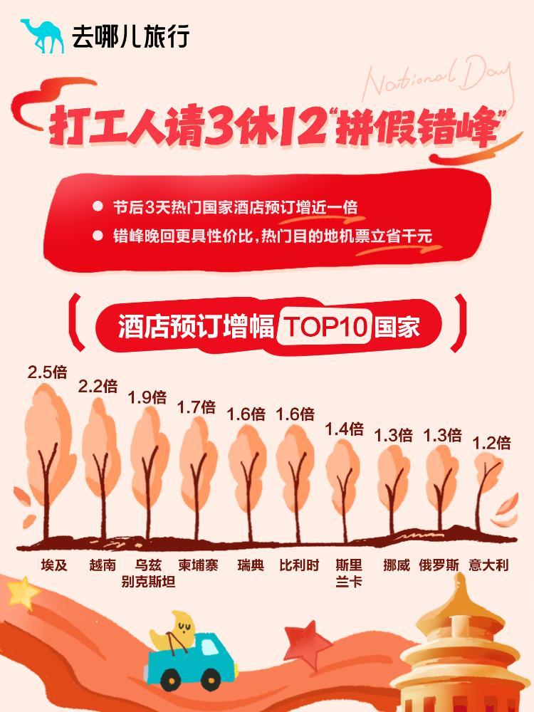 目的地方面,飞猪数据显示,北京、上海、杭州、南京、成都、重庆、西安、长沙、广州、武汉等是国内最热门(截至9月12日)的假期出游城市。泸州、马鞍山、宝鸡、赣州、郴州等城市增速较快,酒店预订量同比均录得3倍以上增速。