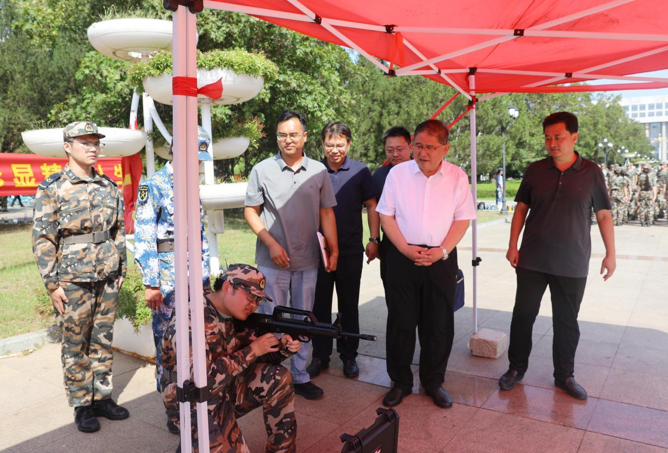 吴衍涛在军训现场实地查看了轻武器模拟射击器材等装备的配备情况,检阅了学生军训科目和药品、饮用水等物资的保障情况,并与军训师生亲切交流,详尽了解了同学们到校后的思想状态与生活情况。