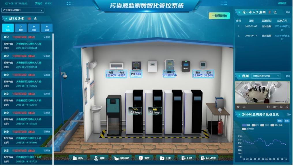 在齐鲁制药有限公司生物医药产业园区的污水总排口,新投入使用的废水污染源自动监测智慧站房在山东省尚属首家。智慧站房由污染源自动监测设备与“大数据+人工智能”融合而成,这也标志着济南市污染源自动监测由“人员运维”向“数智驱动”升级。